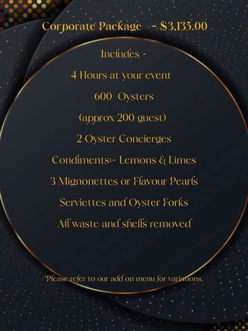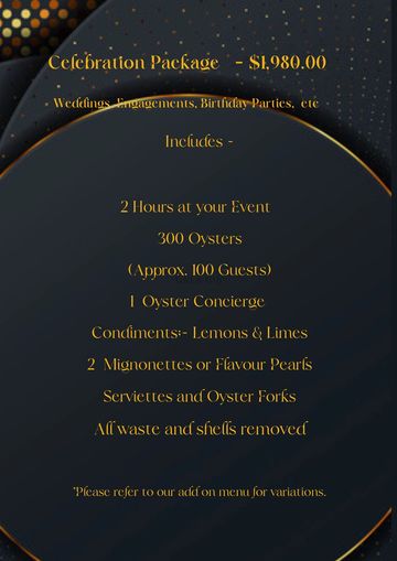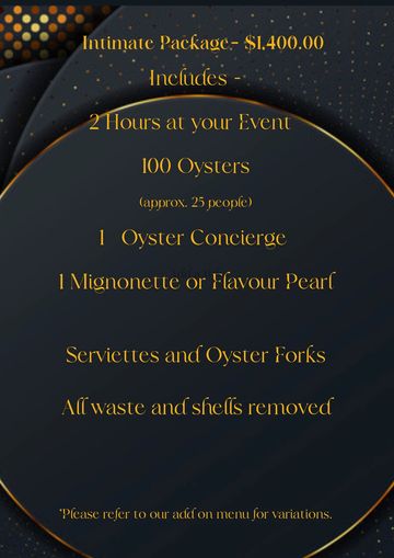 T'S & C's - Oyster Soiree will always source the very best Sydney Rock Oysters available, however sometimes Mother Nature has other ideas due to weather events. In this case, we will do our utmost to source another species. * 50% booking fee is required to secure your date with the balance payable one week prior to your event. *We do understand at times plans change so please dont hesitate to contact our staff to discuss your concerns.
